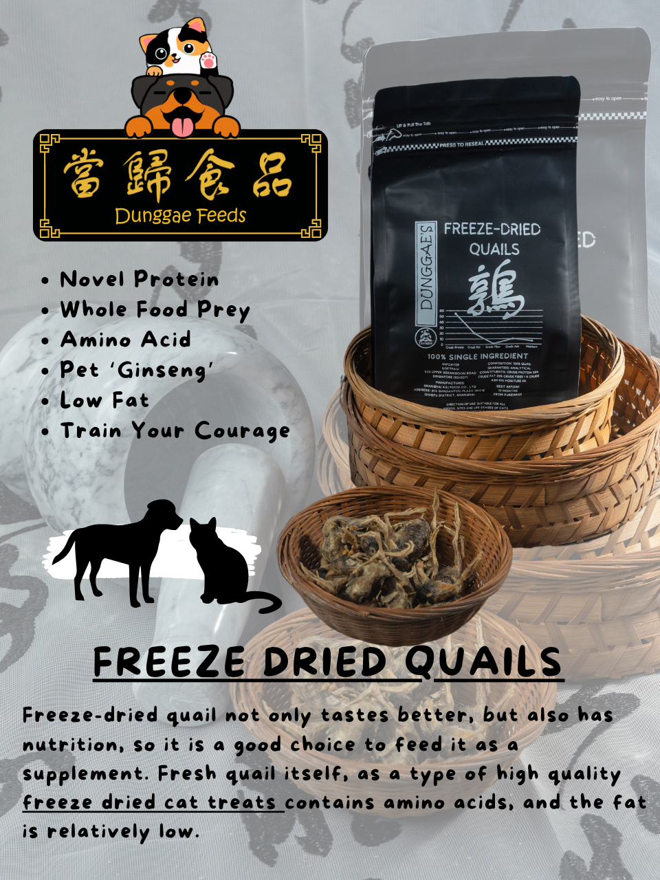 Freeze-dried quail not only tastes better, but also has nutrition, so it is a good choice to feed it as a supplement. Fresh quail itself, as a type of high quality freeze dried cat treats contains amino acids, and the fat is relatively low.
